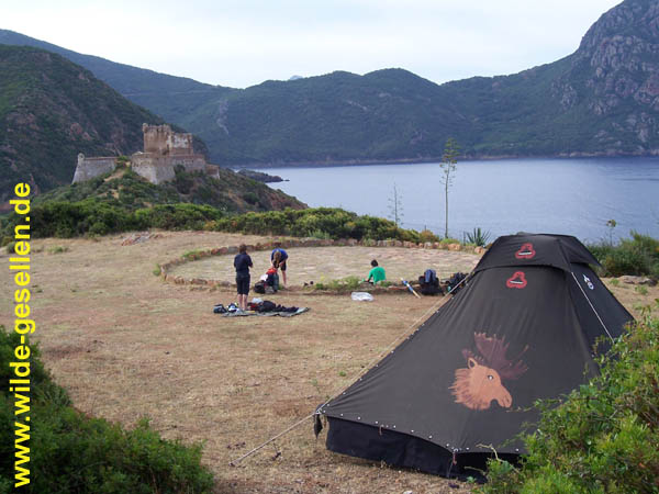 | Pfingsthaijk - Unser Lagerplatz neben der Burg von Galeria. Einem kleinen Dorf das nur zu Fuß oder mit dem Boot erreichbar ist | ||