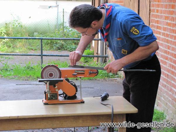 Schmiedetag - An der Bandschleifmaschine wird die Klinge in Form gebracht.